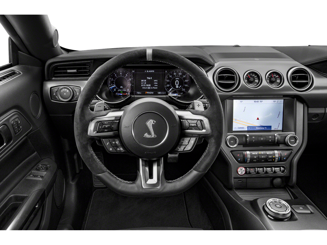 The Shelby GT500's striking Blue exterior is complemented by the High-Intensity Discharge Headlights, Heated Mirrors, and 20-inch Flow Formed High Gloss Black Aluminum wheels, creating a bold and aggressive presence. Cutting-edge safety features, including the BLIS Blind Spot Information System and Cross-Traffic Alert, provide added peace of mind on every journey.